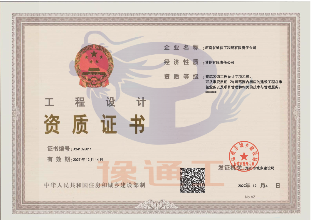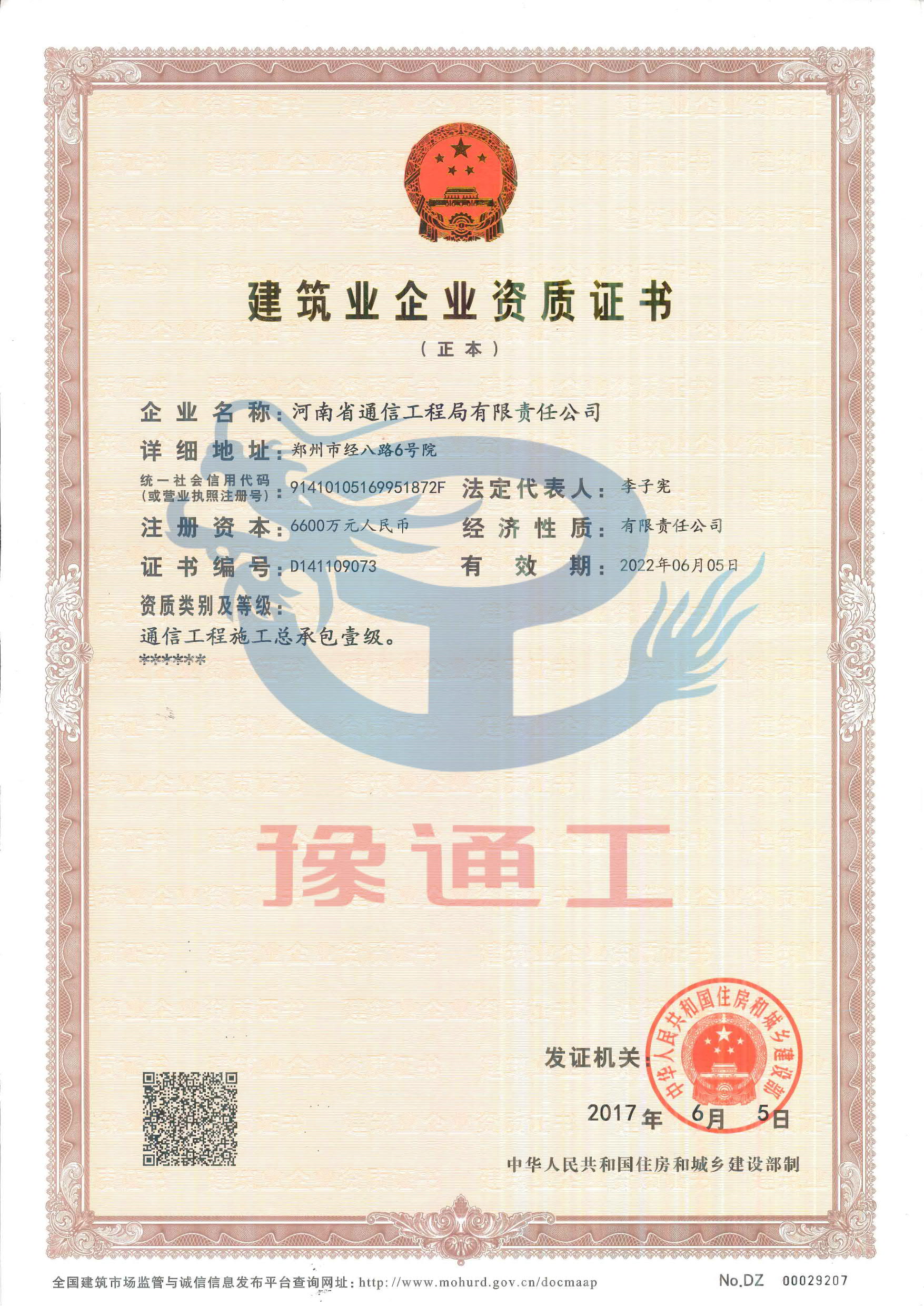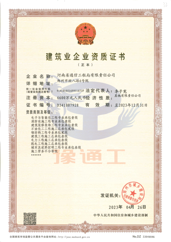電子與智能化、建筑裝修裝飾、消防設(shè)施工程專(zhuān)業(yè)承包壹級(jí);鋼結(jié)構(gòu)工程專(zhuān)業(yè)承包貳級(jí);建筑工程、電力工程、機(jī)電工程、城市及道路照明工程專(zhuān)業(yè)施工總承包叁級(jí);施工勞務(wù)不分等級(jí)。